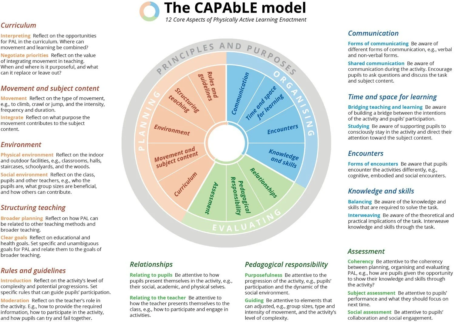 Gjennom arbeidet med artikkelen har CAPAbLE-modellen blitt utviklet, og den har til hensikt å støtte lærere og andre i planlegging, organisering og evaluering av fysisk aktiv læring i undervisning. Artikkelen er publisert i det internasjonale tidsskriftet Scandinavian Journal of Educational Research, januar 2025.