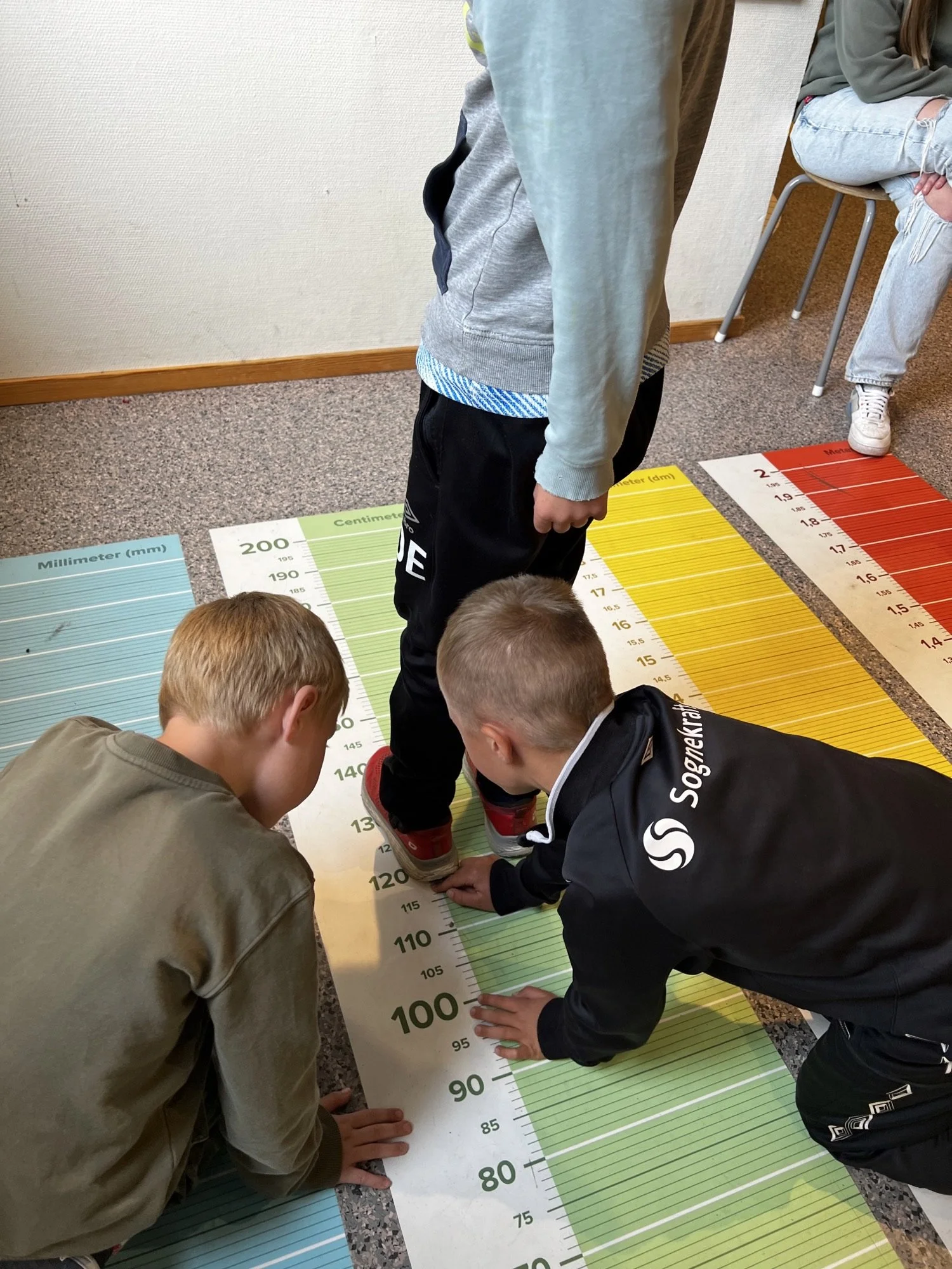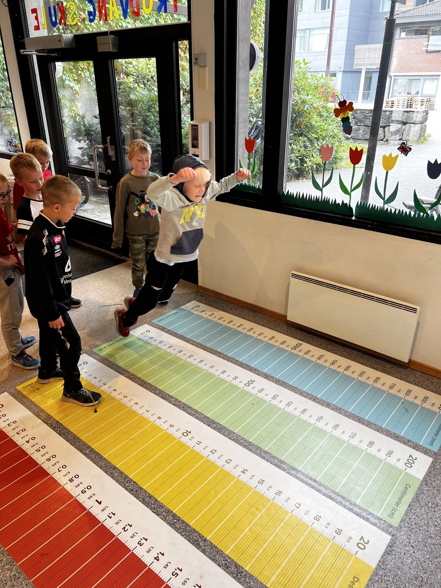 Elevene jobber sammen i gruppe eller to og to. To elever hopper lengde og elevene samarbeider om å måle hvor langt de hopper til sammen. På whiteboardtavlene regner de ut hvor langt de to elevene hoppet til sammen ved å stille opp regnestykket. Så gjennomfører de på nytt med andre som hopper (dersom de jobber i gruppe).